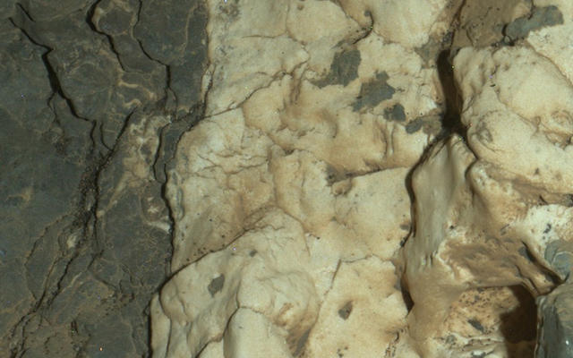 This view from the Mars Hand Lens Imager on the arm of NASA's Curiosity Mars rover is a close-up of a two-tone mineral vein at a site called "Garden City" on lower Mount Sharp. It was taken during night, illuminated by LEDs, on March 25, 2015.