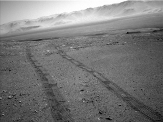 As indicated by our long wheel tracks in the Navcam image above, our planned ~25-meter drive on Sol 1896 was successful, bringing us to another stop along our route on the Vera Rubin Ridge (VRR). We'll actually spend a few days at this stop, where we plan to assess the surrounding bedrock, soil, and what we think might be a small impact crater.