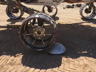 This change in traction is especially problematic when going over pointed, embedded rocks. When this happens, the wheels in front pull the trailing wheels into rocks; the wheels behind push the leading wheels into rocks.In either case, the climbing wheel can end up experiencing higher forces, leading to cracks and punctures. The treads on each of Curiosity's six wheels, called grousers, are designed for climbing rocks. But the spaces between them are more at risk.
