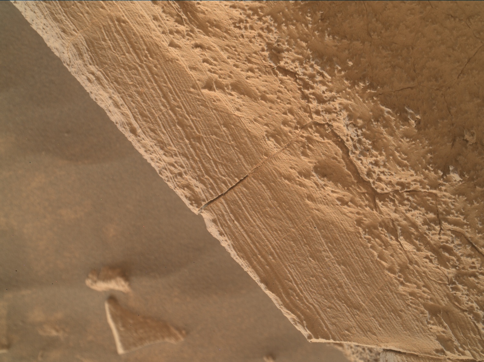 Most images acquired by MAHLI in daylight use the sun as an illumination source. However, in some cases, MAHLI's two groups of white light LEDs and one group of longwave ultraviolet (UV) LEDs might be used to illuminate targets. When Curiosity acquired this image, the group 1 white light LEDs were off, the group 2 white light LEDs were off, and the ultraviolet (UV) LEDS were off.