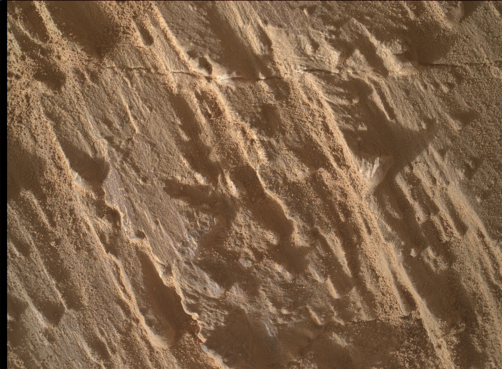 Most images acquired by MAHLI in daylight use the sun as an illumination source. However, in some cases, MAHLI's two groups of white light LEDs and one group of longwave ultraviolet (UV) LEDs might be used to illuminate targets. When Curiosity acquired this image, the group 1 white light LEDs were off, the group 2 white light LEDs were off, and the ultraviolet (UV) LEDS were off.