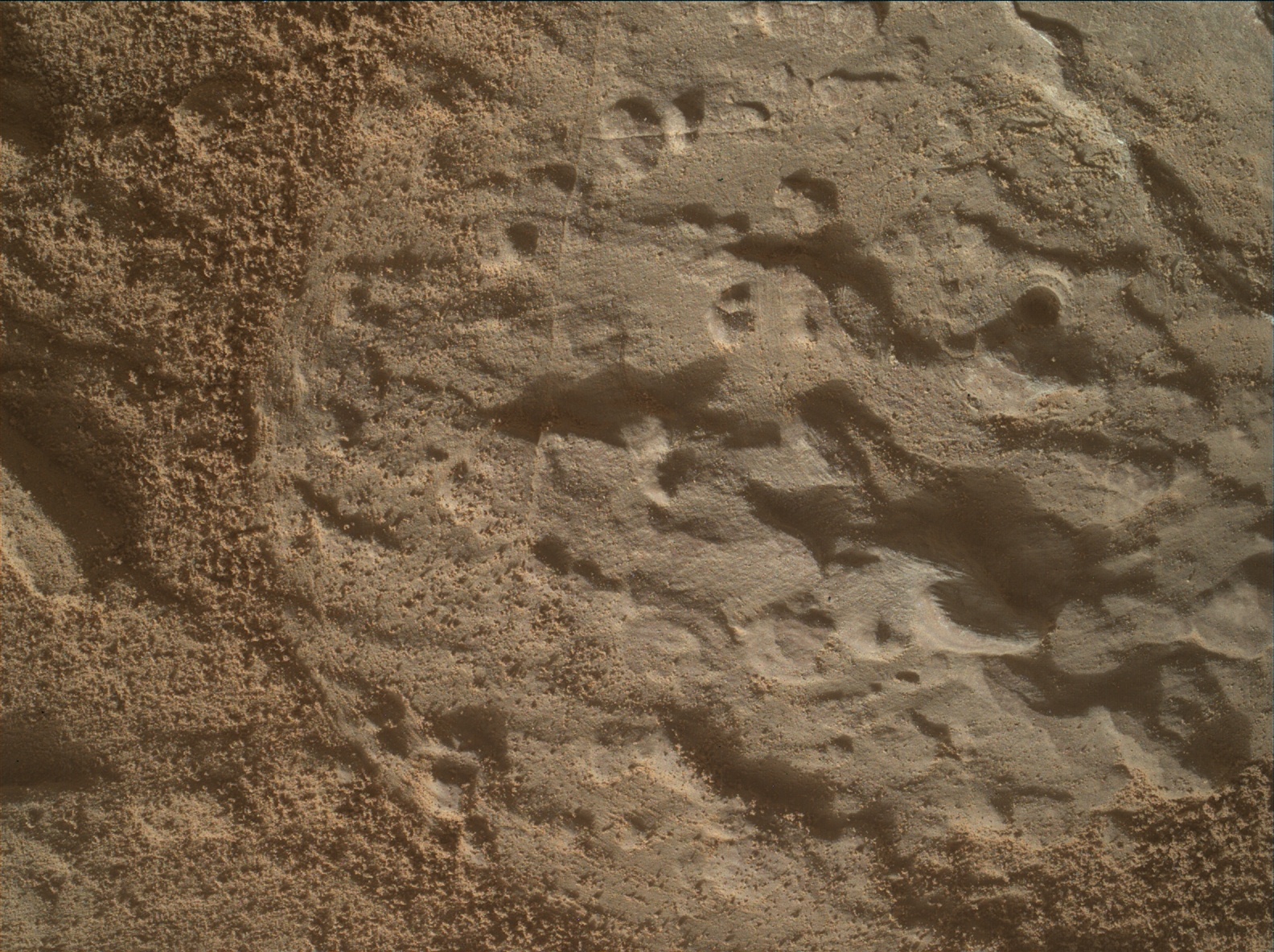 Using an onboard focusing process, the Mars Hand Lens Imager (MAHLI) aboard NASA's Mars rover Curiosity created this product by merging two to eight images previously taken by the MAHLI, located on the turret at the end of the rover's robotic arm.