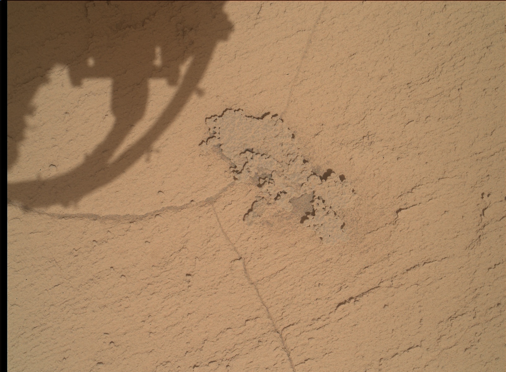 Most images acquired by MAHLI in daylight use the sun as an illumination source. However, in some cases, MAHLI's two groups of white light LEDs and one group of longwave ultraviolet (UV) LEDs might be used to illuminate targets. When Curiosity acquired this image, the group 1 white light LEDs were off, the group 2 white light LEDs were off, and the ultraviolet (UV) LEDS were off.